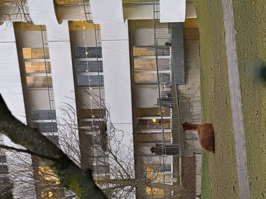 The image displays an outdoor scene in Berlin, Germany, depicting a residential building and a grassy area, likely during twilight. A reddish-brown alpaca or llama is observed lying on a patch of green and brown grass in the mid-ground, facing to the right, with its head raised. A paved pathway of grey rectangular stones runs horizontally across the lower-middle of the grassy expanse. In the background, a multi-story residential building with a light-colored facade (white/light grey) features numerous windows and balconies with metal railings. Several windows are illuminated with warm yellow light from interior sources, and string lights are strung across multiple balconies, particularly on the lower levels. On a ground-level balcony to the left, visible objects include outdoor chairs, a table, and a dark, unidentified upright object near the railing. A concrete retaining wall separates the grassy area from the elevated foundation of the building. A large, leafless tree branch with some moss partially obstructs the upper-left portion of the building, and another smaller, bare tree stands to the left of the building's lower levels. No human subjects are visible within the frame.