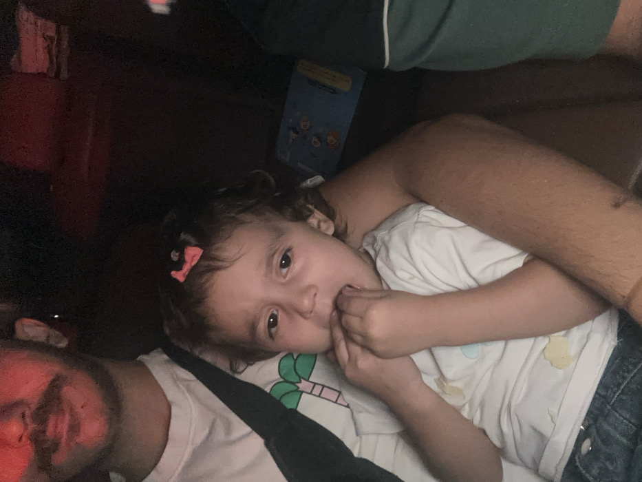 The image displays a dimly lit interior scene featuring two individuals, with a third partially visible. In the center, a young child with dark, curly hair and a pink bow is seated, looking towards the viewer with fingers near or in their mouth. The child wears a white t-shirt with light-colored graphics and blue denim shorts. To the left, an adult is visible from the nose to the upper chest, possessing a mustache and short beard, wearing a white t-shirt with a light green palm tree design and a black strap crossing the chest. A reddish glow illuminates parts of the adult's face and shirt. The adult's arm is visible, positioned around the child. To the far right, a third individual is partially visible, wearing dark green shorts with a white stripe. In the background, to the right of the child, a faint blue object with white text or graphics is discernible. The specific location within Al-Qaboun Municipality, Syria, cannot be determined from the visual information present in the image.