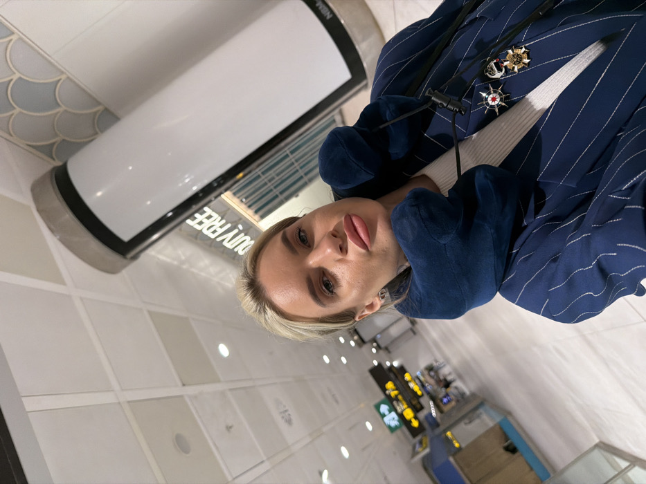 A female subject with blonde hair and light-colored eyes is centrally positioned, looking directly at the camera with slightly pursed lips. She is wearing a dark blue pinstriped blazer over a white ribbed top, with a dark blue U-shaped travel neck pillow around her neck. Three ornamental pins are affixed to her blazer's lapel: a white star with a red center and black points, a gold-colored pin featuring a white and black design (resembling a stylized skull or helmet), and a smaller gold-colored object. The setting is an indoor terminal at Ibiza Airport (Aeroport d'Eivissa) in Sant Josep de sa Talaia, Spain, identifiable by "DUTY FREE" signage visible on a storefront behind a large, illuminated cylindrical pillar to the subject's right. The ceiling features square panels with recessed lighting, and the floor is a light-colored, reflective surface. In the background, to the left, are blurred green and yellow directional signs typical of an airport.