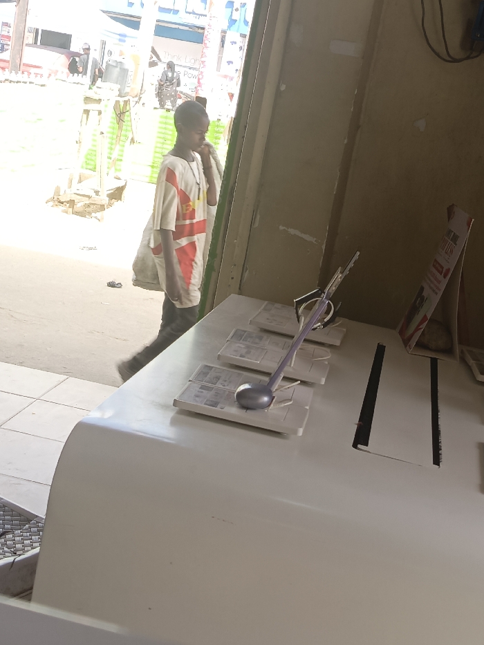 A young boy in a t-shirt walks outside a building. On a white counter inside the building are several displays of identification cards, one with a long-handled dipper in front. A vertical sign with promotional text stands to the right. The building's exterior is weathered and features an open doorway. Outside, there is a glimpse of a street scene with people and buildings under bright sunlight.