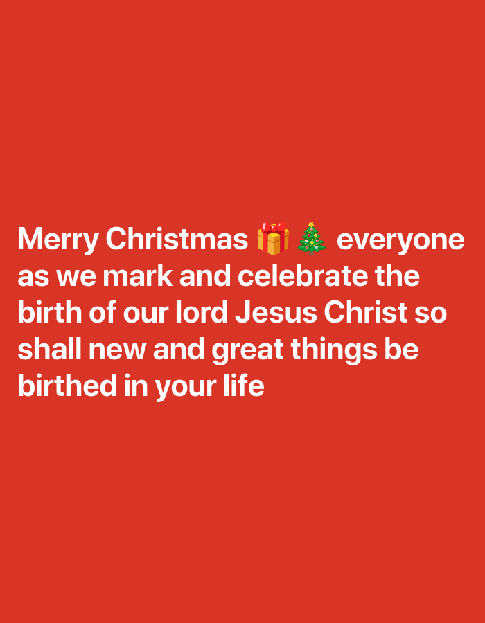 A solid red background features white text in the bottom half, conveying a Christmas message. "Merry Christmas" is followed by a gift and Christmas tree emoji, and the word "everyone." The subsequent text celebrates the birth of Jesus Christ, expressing a hope for "new and great things" to be "birthed" in the reader's life. The overall tone is religious and celebratory, evoking the spirit of Christmas.