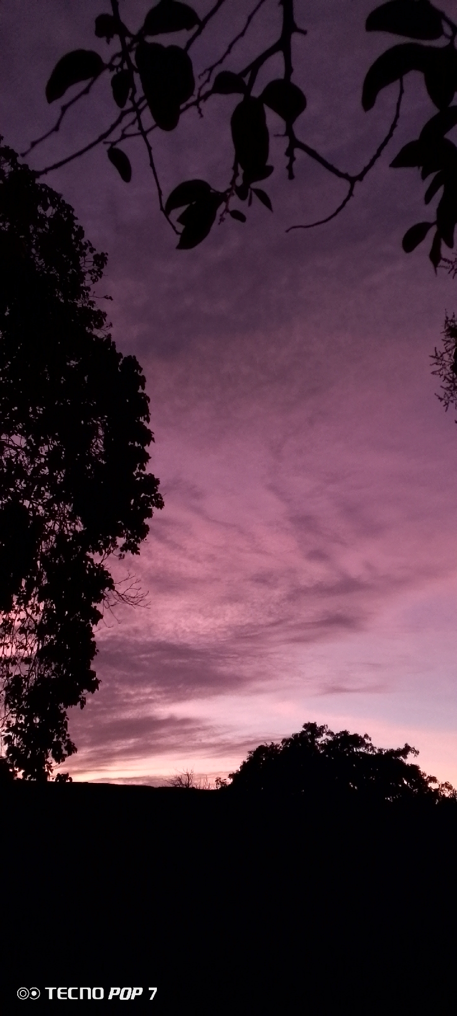 dusky pink and purple sky at what appears to be twilight or dawn. The bottom half of the frame is predominantly dark, silhouetted forms suggestive of trees and vegetation along a horizon line. Silhouette tree branches with leaves are present in the upper part of the image as well. The text "TECNO POP 7" is visible at the bottom left corner of the image. The location of the image is Altagracia, Venezuela.