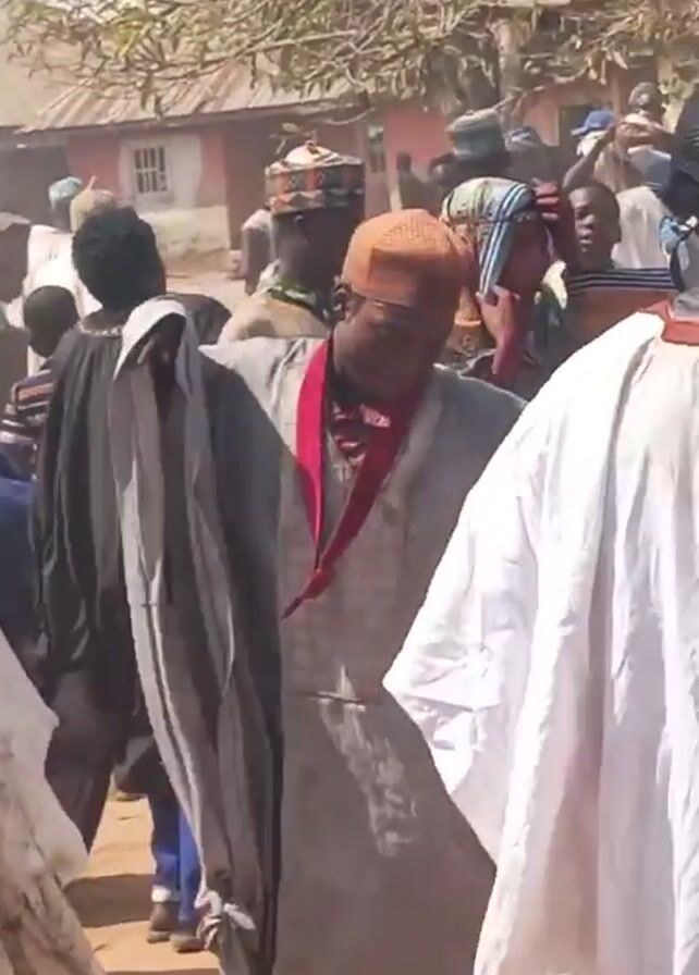 A crowded outdoor scene shows a procession of people walking past the camera. Most of the people are men and wear traditional African clothing. Many are wearing hats of various styles. The men wear robes in shades of beige, blue, white, and green. One person holds a cane. In the background are buildings and trees. Music plays.