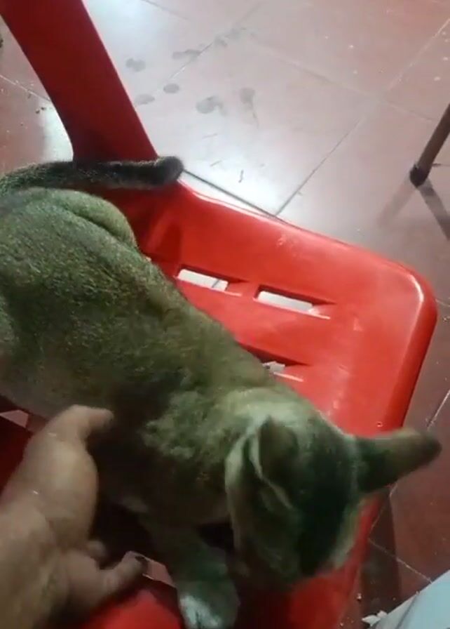 A hand pets a cat sitting on a red plastic chair. The cat, light green and gray, stands up and jumps off the chair. The floor is tiled. Another chair is visible in the background.