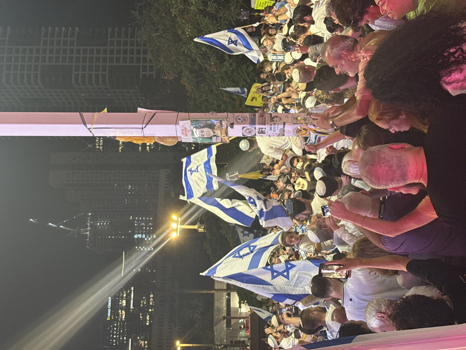 A dense nocturnal crowd is gathered outdoors in the Azrieli Center area of Tel Aviv, Israel. The scene is dominated by numerous individuals of varying ages, many wearing kippahs, holding and waving Israeli flags with a blue Star of David on a white background. Several people are seen raising smartphones to capture the event. In the foreground, to the right, a thick, pink-lit vertical pole is prominently featured. Adhered to this pole are multiple posters, including one displaying the face of a young woman, along with yellow ribbons or fabric. In the mid-ground, a person wearing a white shirt and kippah stands on what appears to be the base of the pole, facing away from the camera. The background reveals a cityscape with several illuminated high-rise buildings, some under construction, against a dark night sky. One building clearly displays a "HADAG GROUP" sign, and the distinctive silhouette of the Azrieli Spiral Tower under construction is visible. Bright artificial lights, including streetlights and powerful spotlights, cast prominent beams across the scene. The atmosphere is highly communal and appears to be a large-scale public gathering or demonstration.