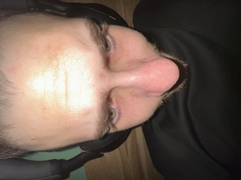 The image presents a high-angle, close-up view of an individual's face, observed from a perspective looking downward. The subject, likely an adult male with light skin, possesses light brown eyebrows, green-hued eyes, and visible stubble around the lower nasal and upper lip areas. The forehead exhibits several minor red blemishes and subtle skin texture. Black over-ear headphones are worn, visible on both sides of the head. The individual is dressed in a black, indeterminate garment, possibly a shirt, visible below the chin. The background consists of blurred, indistinct surfaces: a green tone on the left and a lighter, possibly wooden, texture on the right. The lighting is direct and strong, particularly on the forehead. The scene is an indoor environment in Hà Nội, Vietnam.
