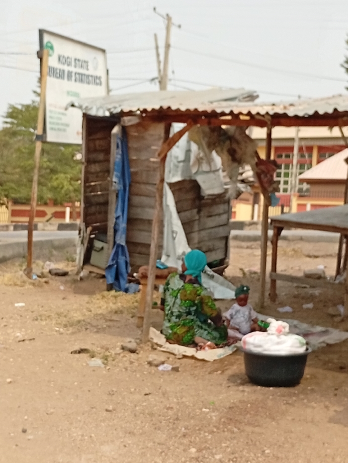 The image depicts a roadside scene in Adankolo, Kogi State, Nigeria. In the foreground, a dirt ground with sparse debris extends across the frame. Centrally, a makeshift stall constructed from rough wooden planks and poles supports a corrugated metal roof. Blue fabric and white tarpaulin hang within the stall's opening. To the right of this stall, an adult female, wearing a green patterned dress and a light blue head covering, sits on a white mat on the ground, facing partially away from the viewer. A young child, dressed in a light-colored outfit and a green cap, sits beside her to the right, also on the ground. In front of the child, a black plastic basin contains a pile of white, soft material. In the background, to the left, a white billboard prominently displays "KOGI STATE BUREAU OF STATISTICS." A paved road runs behind the sign and structures, beyond which distant buildings with red roofs and yellow walls are visible under an overcast sky. A utility pole stands to the right of the billboard.