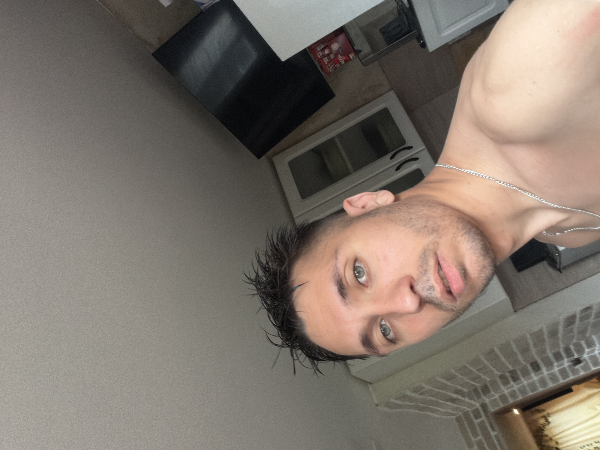 A shirtless male with a silver chain is facing the camera indoors. The background features kitchen elements, including a television, cabinets, and a brick archway. The location is not discernible as being in Vardim, Bulgaria, from the image itself.