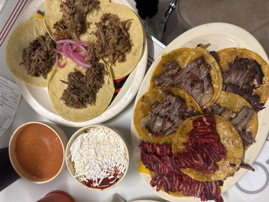 Two plates of tacos, one with four tacos topped with shredded meat and pickled red onions. The second plate has six tacos; five with sliced beef and one with intensely red meat. A container of soup or sauce and another with cheese and sauce sit beside the plates. The receipt for the meal is partially visible.