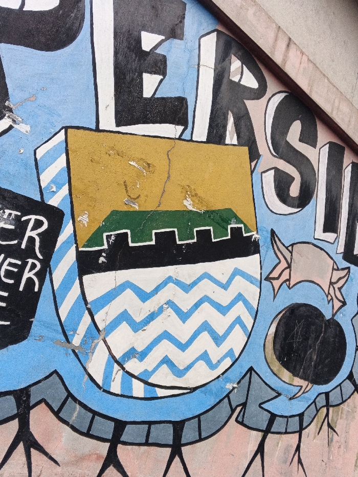 close-up of a mural. A shield dominates the scene, featuring a gold top, green middle, and a base of alternating white and light blue zigzags. Above the shield, large black and white letters are partially visible, reading "ERS". To the side, more letters seem to spell "SIL". The lower portion of the mural includes stylized shapes and black outlines. The overall impression is that of a colorful, graphic composition on a textured surface.