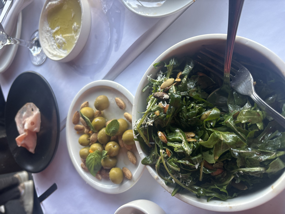 A table setting displays various dishes. A black plate holds thin slices of cured meat. A white oval plate contains green olives mixed with almonds and basil leaves. A white bowl is filled with a green salad tossed with seeds and cheese, with a fork nestled within. Another white bowl contains a creamy dip. A wine glass and a white plate complete the setting, all against a white surface.