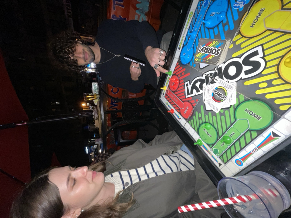 Two individuals are seated at an outdoor dining table at night in a New York City establishment, engaged in a game of "Sorry!"