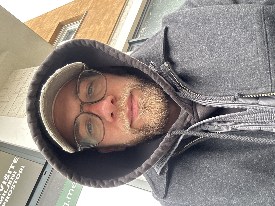 A selfie shows a person wearing a hooded gray coat, a partially visible hooded sweatshirt underneath, and glasses. The person also has a light-colored beard and is wearing a beige baseball cap under the hood. Part of a building and a window are visible in the background. A sign with text in a foreign language can be seen in the lower left corner.