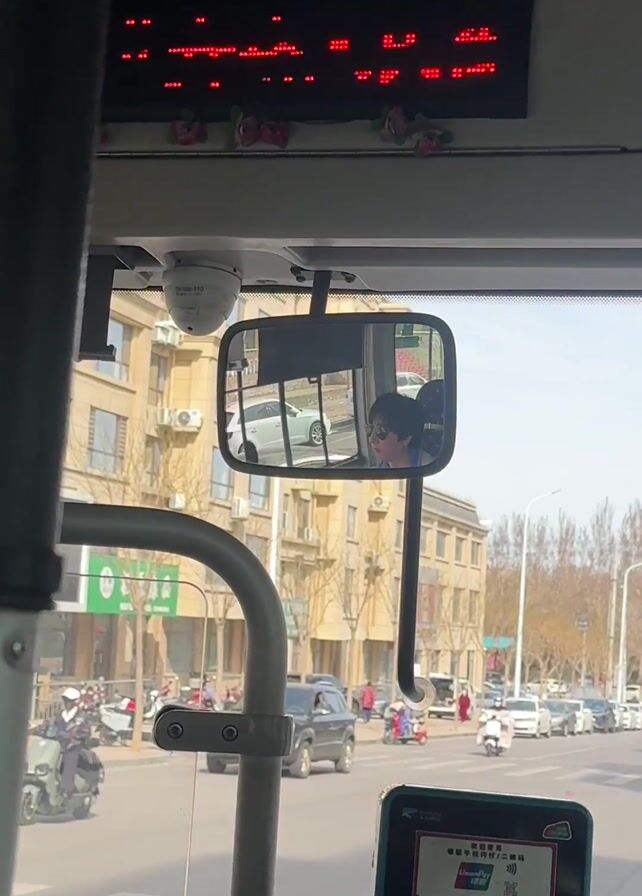 view from inside a bus. A digital fare collection device displays a fare of 2.00. A rearview mirror reflects the inside of the bus, including a person wearing sunglasses. Outside, the bus travels along a street with cars, motorcycles, and pedestrians visible. The environment appears to be a city with buildings lining the street. A hand reaches out and touches the fare collection device.