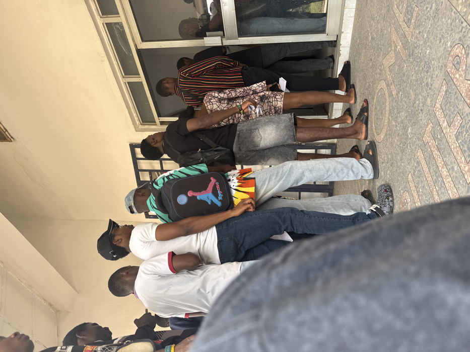 The image displays a queue of at least nine individuals, primarily young adults, standing outdoors in front of a light-colored building facade in Ihiagwa, Nigeria