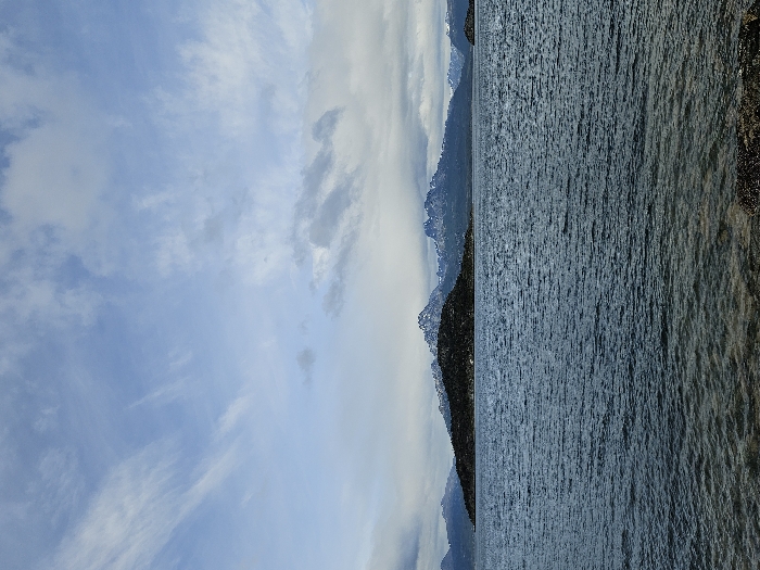 A landscape merges sea and sky. The water is textured with ripples, transitioning to a rocky shoreline. Along the horizon, a mountain range rises. Above, a sky is filled with wispy clouds scattered across blue expanse. The composition presents a serene yet rugged vista.