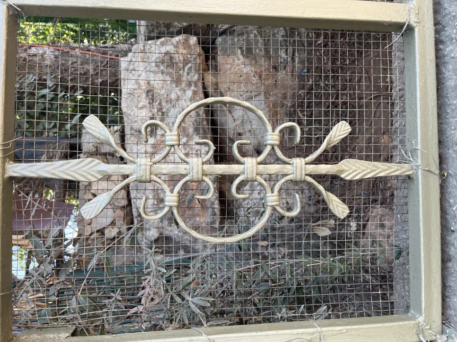 The image displays a close-up, vertical view of a light green or gold-painted metal gate or fence panel, located in the Menashe Regional Council, Israel. The panel features a central, ornate decorative element composed of scrolled and leaf-like motifs, flanked by a fine, silver-colored wire mesh with a square grid pattern. The metal frame of the panel is also painted the same light green/gold color, with minor paint drips visible, particularly at the bottom. Behind the mesh, the environment consists of large, light brown rock formations, sparse green foliage including shrubs with narrow leaves on the left, and a darker, possibly shaded area with denser vegetation on the right. The ground visible through the mesh appears to be dry soil or dirt. The scene is illuminated by natural daylight. No individuals or animals are present.