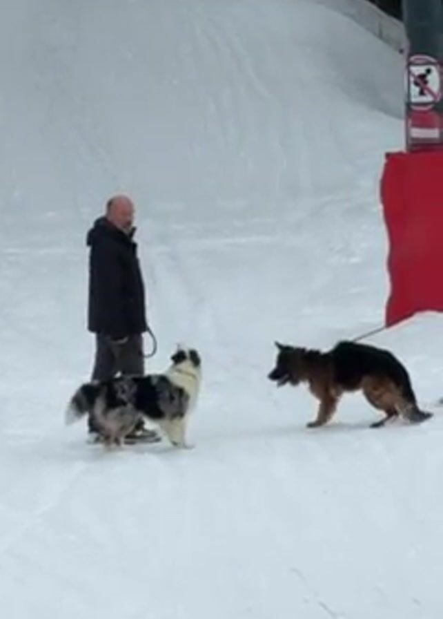 snowy slope with two men and two dogs. One man stands on the left with two dogs - an Australian shepherd on a leash and another behind him that is not fully visible. The other man stands on the right holding a German shepherd on a leash. The dogs face each other but remain at a distance. The slope continues up to a wooded area at the top of the screen. A ski lift is to the right side with a red cushion around its base.