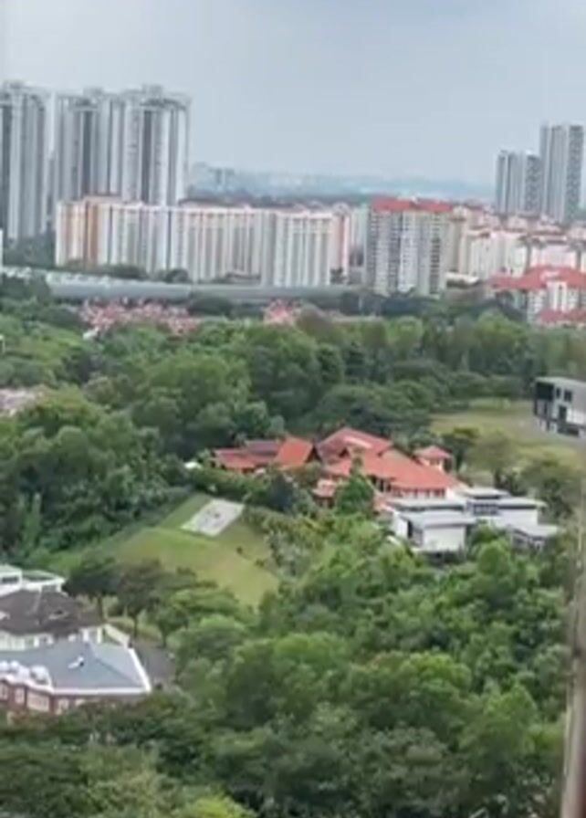 cityscape with several high-rise buildings in the background, with lush green trees and residential houses in the foreground. Cars and motorcycles are visible driving on a road with crosswalks. The sky is overcast, suggesting a cloudy day. The video is taken from an elevated position, potentially a high-rise building or apartment.