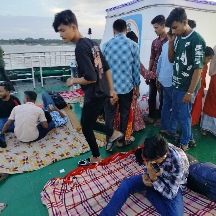 On a boat's deck, several people sit and stand on patterned blankets. One person in the foreground sits cross-legged on a red and white blanket, talking on a cell phone. Another walks by, wearing black pants and a t-shirt. Behind them, a small group is gathered. One is on their phone while another wears a green Nike shirt. A person in a blue plaid shirt stands with their back to the camera. The backdrop features a cloudy sky and distant trees.