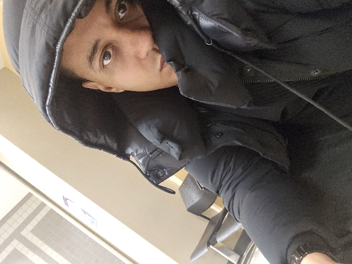 A person with tan skin looks into the camera. The individual is wearing a black hooded puffer jacket. A watch is visible on the left wrist. Background elements include a beige wall and what appears to be a tiled wall or window with a white frame. A chair is partially visible in the lower portion of the image.