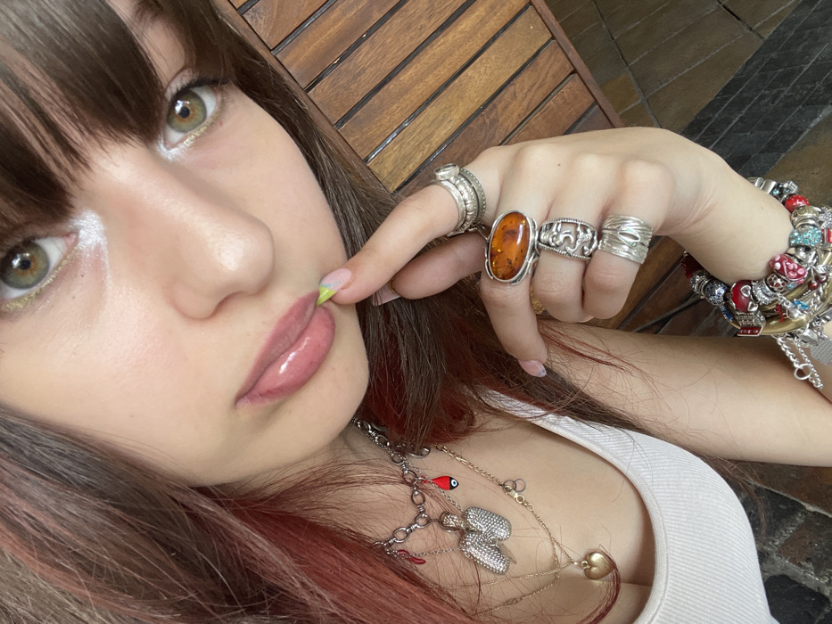 The image displays a close-up, upper-body crop of a female subject, located in Rosebank, South Africa. The subject's face is partially visible, featuring greenish-brown eyes with golden eyeliner, and full, glossy pink lips. Her brown hair, with subtle reddish highlights, includes bangs. The subject's right hand is raised, with the index finger lightly touching her upper lip. This finger exhibits a French manicure with a neon green pointed tip and a light pink base. The visible hand is heavily accessorized with multiple silver rings: the index finger wears a wide, textured silver band, a silver ring with an intricate, curvilinear pattern, and a prominent silver ring set with a large, oval, orange-brown amber stone. Her thumb is adorned with a spinner-style silver ring. On her right wrist, a multi-charm bracelet is visible, laden with numerous colorful beads and small pendants (red, blue, silver, white). Around her neck, a layered arrangement of necklaces is present. These include a thick silver chain with a large, pavé-set "M" initial pendant, several thinner gold chains including one with a small, plain gold heart pendant, and another chain featuring small red teardrop-shaped charms and a red-and-blue evil eye charm. The subject wears a white ribbed tank top. The background is a blurred, dark brown surface composed of vertical wooden slats.