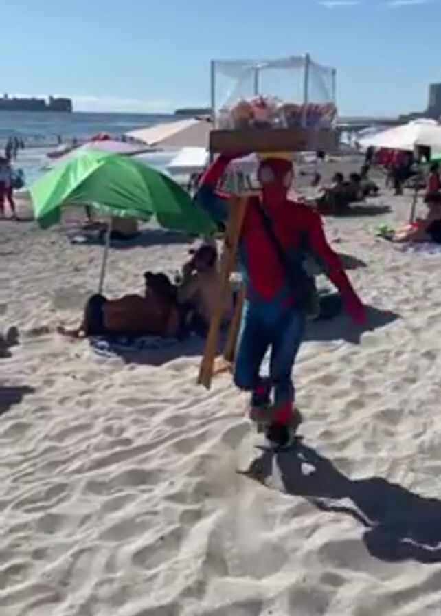 A man dressed as Spider-Man walks on a sandy beach carrying a food tray balanced on his head