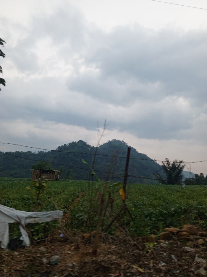 This image depicts an agricultural landscape near Kheda, India, under an overcast sky. The foreground features disturbed earth with dry vegetation, debris including a white fabric, and a thin, leafless sapling. A barbed wire fence, supported by rusty metal posts, traverses the midground horizontally. Behind this fence lies a large, cultivated field of dense green, low-lying crops. In the mid-left, within the field, stands a small, rustic rectangular hut constructed from wood and bamboo, topped with a dark, possibly thatched roof. The background is dominated by densely forested, undulating hills or mountains. The sky above is entirely covered with a thick layer of grey clouds, indicating a heavily overcast condition. No individuals are visible.
