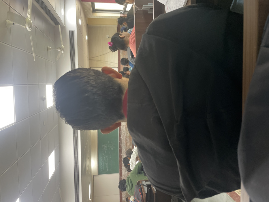 classroom in Jaipur, India (latitude: 26.863, longitude: 75.815). The classroom is brightly lit with white ceiling tiles and fluorescent lights. Several students are present, sitting at desks, facing a chalkboard on the left side of the room. One student is seated with his back to the camera, facing the front of the class. The student's head is turned to the left, partially obscured by his dark hair, giving the impression of a long neck. He is wearing a black jacket. There is a black bag on the desk in front of him. Other students are partially visible in the background. The image is taken from a low angle, looking up at the student. The only writing visible on the chalkboard is a series of equations. The ceiling fans are running. The image appears to have been taken in an educational setting, such as a college or university.