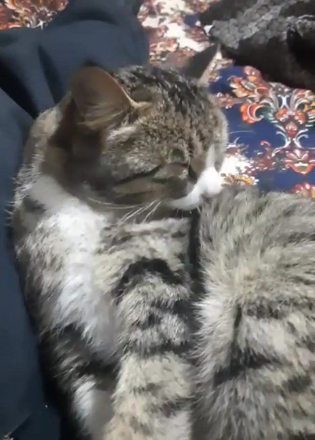 person sitting on a bed with a tabby cat lying on their lap. The cat is mostly grey and white with dark stripes. It is curled up and has its eyes closed, appearing to be relaxed or sleeping. The bed has a patterned blanket with floral designs. The person is wearing dark clothing and socks. There is indistinct speech in the background.