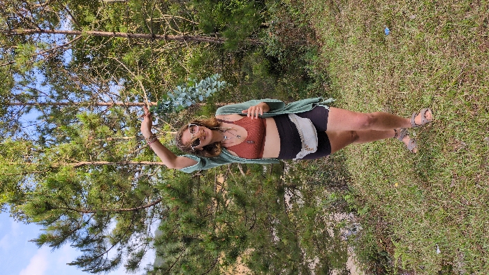 A single individual, identified as an adult female, stands outdoors in a natural setting within the city of Lán Tranh, Vietnam. She faces slightly right of the camera, turning her head to smile directly at the viewer. She wears large, light-framed sunglasses, multiple layered necklaces with assorted pendants including a cross, a rust-colored ribbed bralette, an open sage-green kimono-style cardigan, black athletic shorts, and light brown strappy sandals with an ankle bracelet on her left ankle. A white patterned fanny pack is worn around her hips. Her right arm is raised above her head, holding a sprig of light green foliage, possibly eucalyptus. Her left arm is bent at the elbow, hand resting near her waist. The ground is covered in green and dry grasses, with visible patches of soil. The background features a dense stand of tall, slender trees, consistent with conifers, under a blue sky with scattered white clouds. Distant mountains or hills are partially visible on the far left horizon. The scene is brightly lit by natural sunlight.