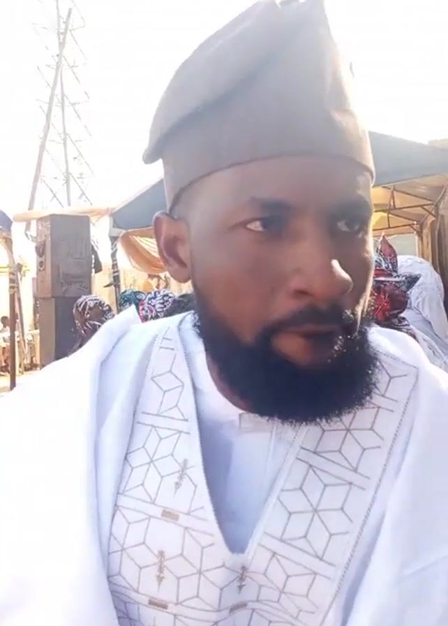The video features two men wearing traditional Nigerian clothing, specifically a white robe with intricate geometric patterns and brown caps. The first man, with a full beard, stands and looks directly at the camera. He appears to be speaking, though the audio is not described. The camera then pans slightly to the side, showing the man sitting, and he smiles at the camera. The setting appears to be outdoors, possibly a gathering or event, with a temporary structure, chairs, and other people visible in the background. There is a sense of community and possibly celebration.