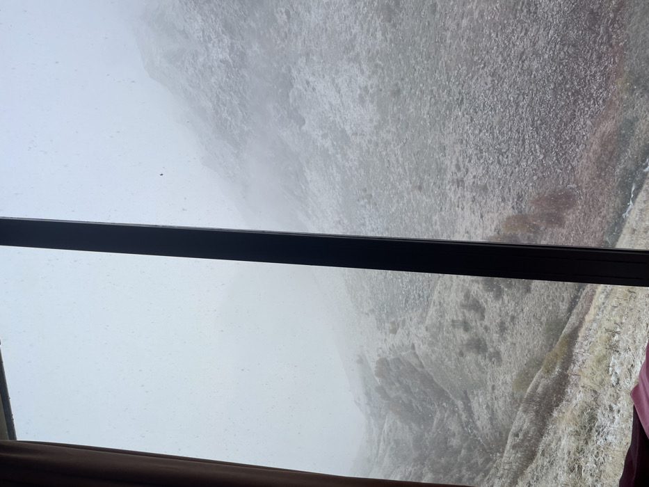 The image displays a snow-dusted mountainous landscape viewed from indoors through a window. A dark, thick vertical window mullion divides the scene centrally. To the left, a partial brown curtain frames the interior edge. A small area of reddish-pink fabric is visible along the bottom edge of the frame. The exterior scene reveals a valley on the left, featuring descending slopes covered in sparse, snow-dusted vegetation, including pale grasses and scattered small trees with reddish-brown foliage. A narrow stream or river winds through the valley floor at the bottom. On the right, a steep, rocky mountain face rises, also covered with a light dusting of snow. Patches of fog or low-hanging clouds obscure sections of the mountain face and the upper portions of the valley, creating a misty atmosphere. The sky is uniformly overcast and light gray. Numerous small white specks are visible across the entire outdoor view, indicating light snowfall. No individuals, animals, or specific structures are discernible within the outdoor environment. This scene is consistent with the high-altitude, rugged terrain found near Juta, Georgia, during winter or late autumn.