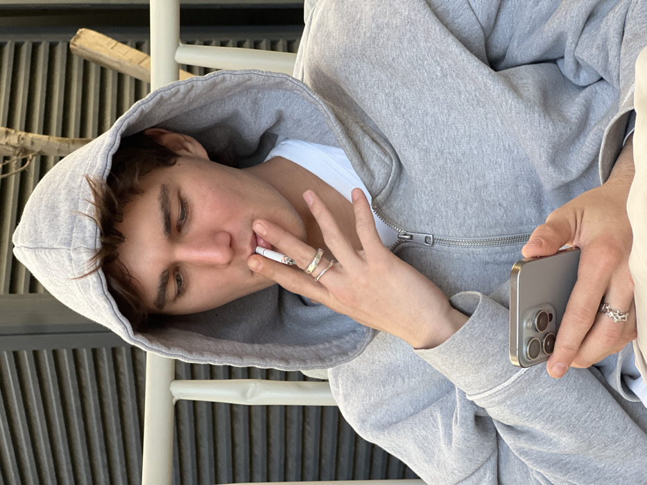 A young man wearing a grey hoodie, his face partially obscured by the hood, holds a cigarette in his mouth and a smartphone in his hand. He has short, dark hair and several rings on his fingers. He is wearing a white t-shirt under the hoodie. The background includes a slatted wall and a white railing. The photo is taken from a slightly angled perspective.