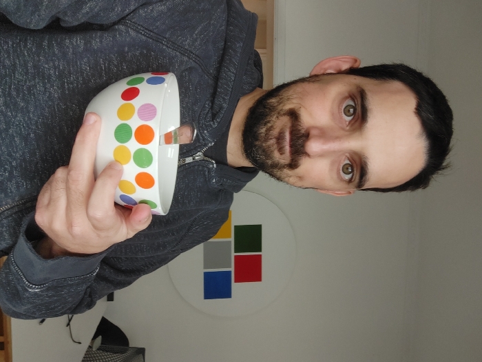 A person with dark hair and a beard is holding a bowl with colorful dots