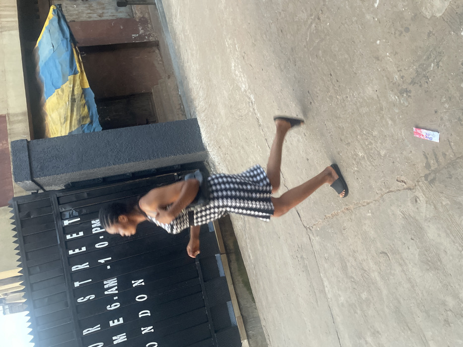 A woman in a black and white checkered dress and black sandals is walking on a concrete path. She carries a black bag over her shoulder. Behind her is a black gate with white text that reads "STREET" and "LONDON". A yellow and blue tarp is partially visible above the gate. A small, rectangular item lies on the ground near her feet.