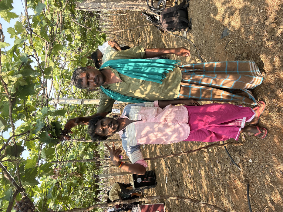 Two adult males are standing in the foreground of a sunlit vineyard in Chinnalapatti, India