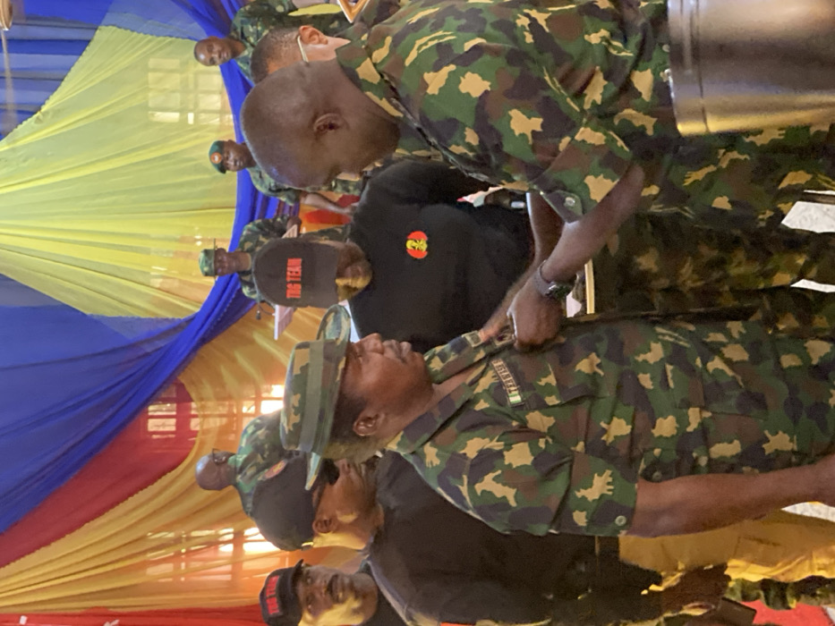An indoor ceremony is depicted in Kachia, Nigeria, where a male military officer, identified by the nametag "IYANIWURA" on his camouflage uniform, is having a metallic badge or medal pinned to his left chest by another male officer, also in a camouflage uniform