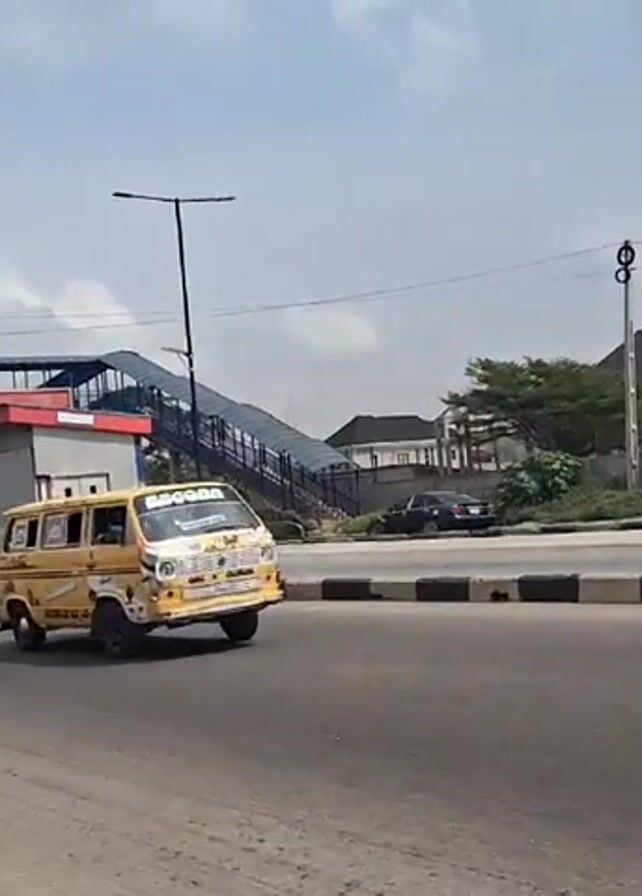 street in an urban area during the daytime. Cars, motorcycles, and yellow minibuses are driving on the road. There is a pedestrian overpass with a small building underneath it. The overpass has a sign that reads "SportyB." There are trees and buildings in the background. The sky is partly cloudy.