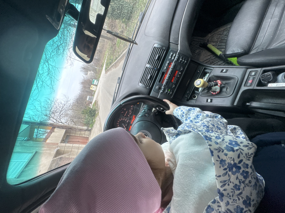 The image captures the interior of a dark-colored passenger vehicle, consistent with a BMW E46 model, viewed from a slightly elevated position behind the driver's seat. A young child, wearing a pink ribbed beanie, a white fleece garment, and a blue and white floral-patterned jacket, is seated in the driver's position with both hands on the black steering wheel. The vehicle's dashboard displays an illuminated instrument cluster, and the center console features a climate control unit indicating "26.5 °C" in red, positioned above a radio unit. A manual gear shifter with a distinctive yellow knob and a red and white braided object at its base is located on the center console. A black air freshener hangs from the rearview mirror, which reflects the partial face of an adult. On the passenger side floor, a black rubber mat is visible, with a green-handled object resting on it. Outside the vehicle, the scene depicts a street in Gorna Oryahovitsa, Bulgaria. A two-story building with a light-colored, weathered facade and a reddish-brown door or shutter is visible on the left side of the frame. The paved road ahead curves gently to the right. The surrounding environment includes bare deciduous trees and sparse green vegetation, suggesting a late winter or early spring season. Further down the street on the right, three upright waste bins, colored green, yellow, and a lighter shade, are positioned roadside. The sky is bright and appears overcast.