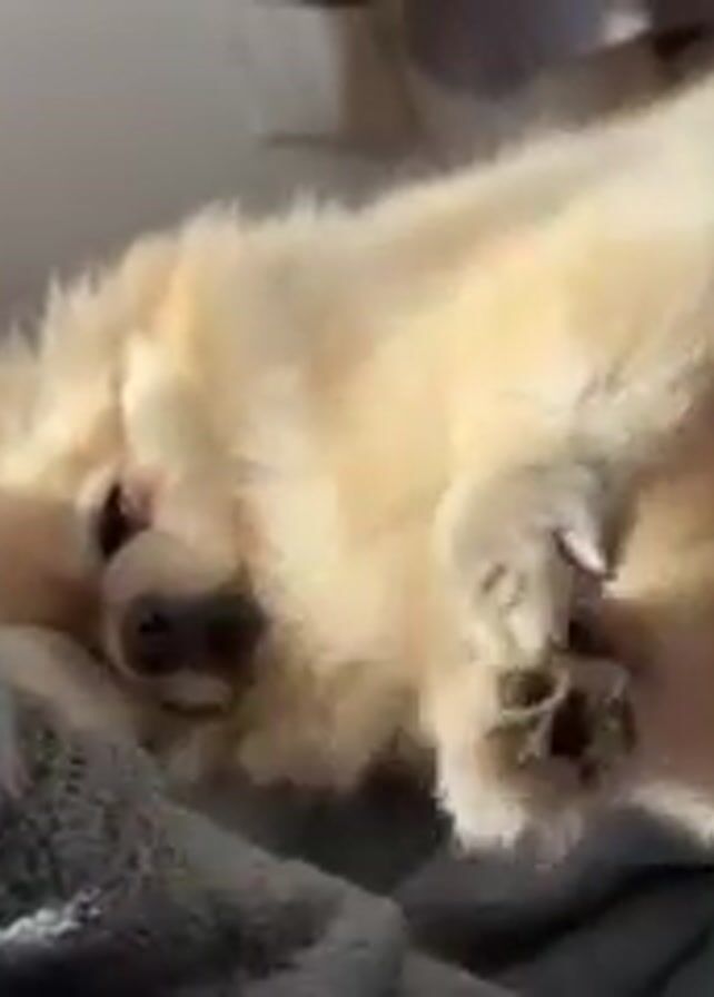 A tan-colored, small, fluffy dog is lying on a bed covered with white and light blue blankets. The dog is mostly still, but it shifts slightly as a person's hand gently pets its belly. A stuffed animal is visible in the background on the left. The scene is brightly lit, likely by natural sunlight.