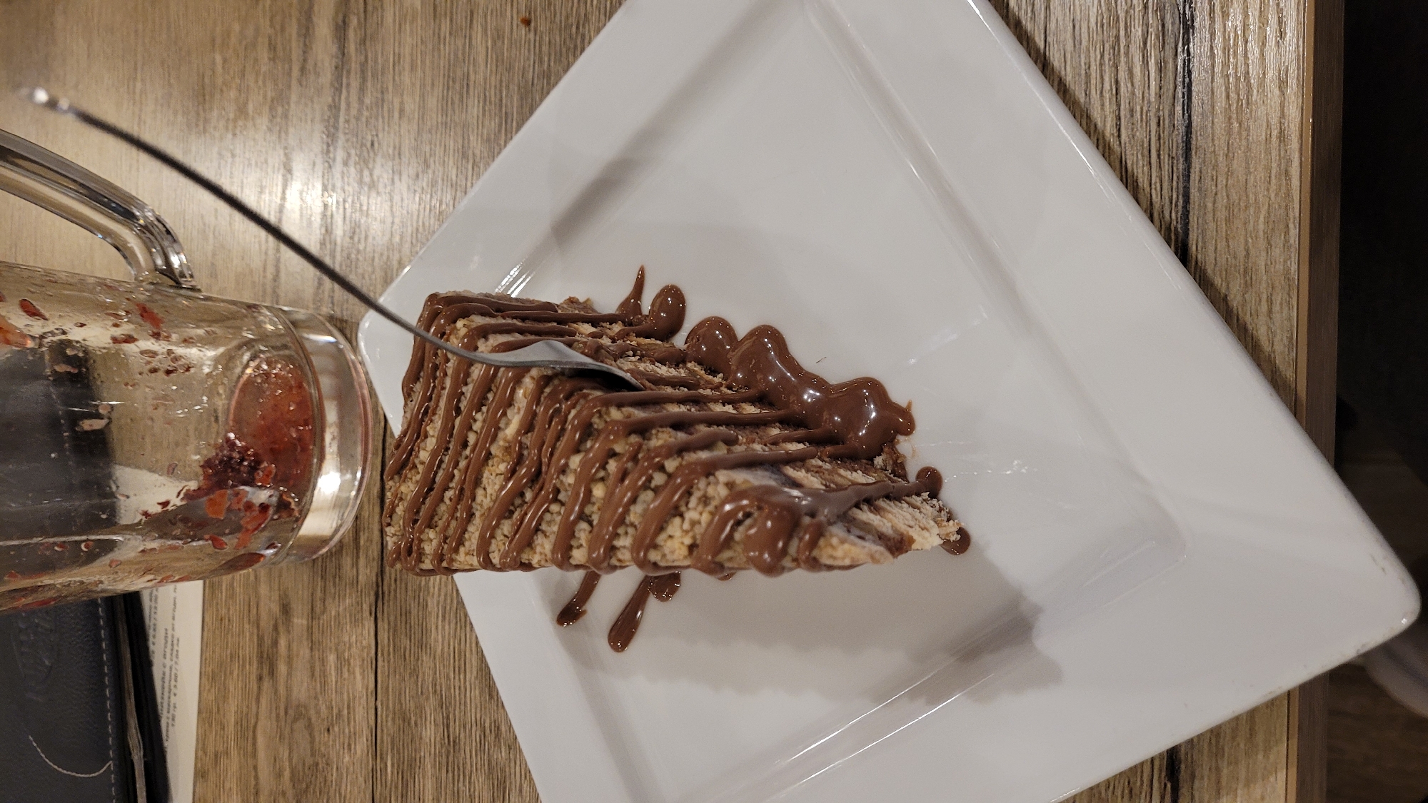 A slice of chocolate-drizzled cake sits on a square white plate on a wooden table. A nearly empty glass with remnants of a red substance is adjacent to the plate. A fork is piercing the cake. The setting may be a cafe or restaurant. The location is Varna, Bulgaria. The scene suggests consumption of dessert.