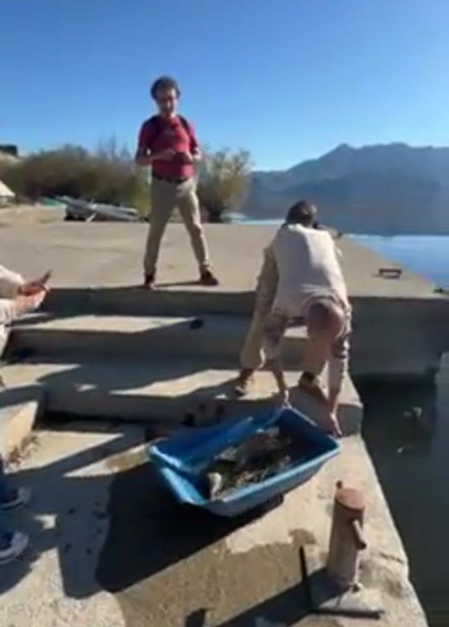 three people on a cement pier at a body of water. A man, facing the water, is bending over a blue bin containing fish. A child is standing next to him. Another man is standing on the steps leading to the pier, and a woman is standing to the side. The man bending over lifts the bin and tips it into the water. The fish, which are various sizes, are released into the water. The camera follows the bin as it tips and splashes into the water. The background shows a clear, blue sky, and mountains. The water is calm, with the mountain range reflected in the water.