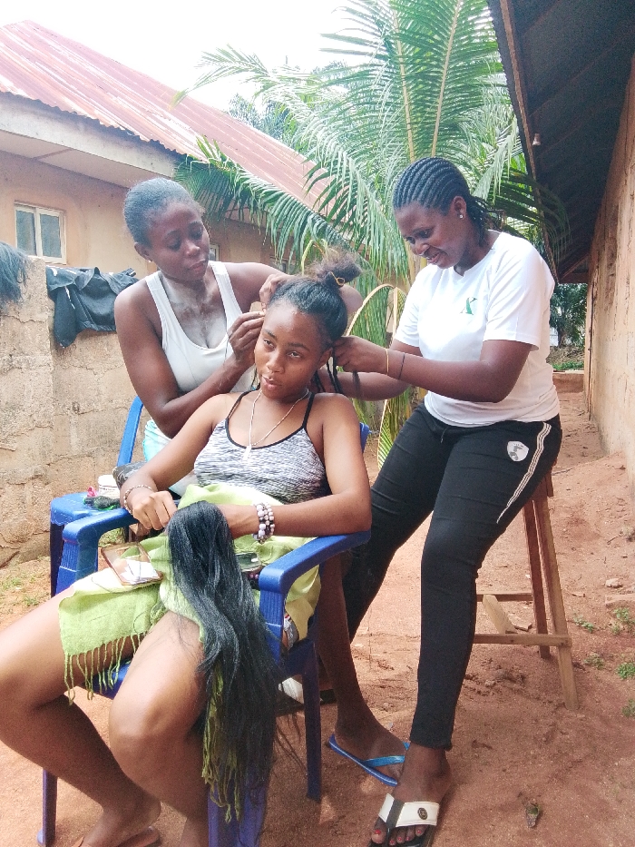 The image captures an outdoor scene in Agbor, Nigeria, where a young woman is getting her hair braided