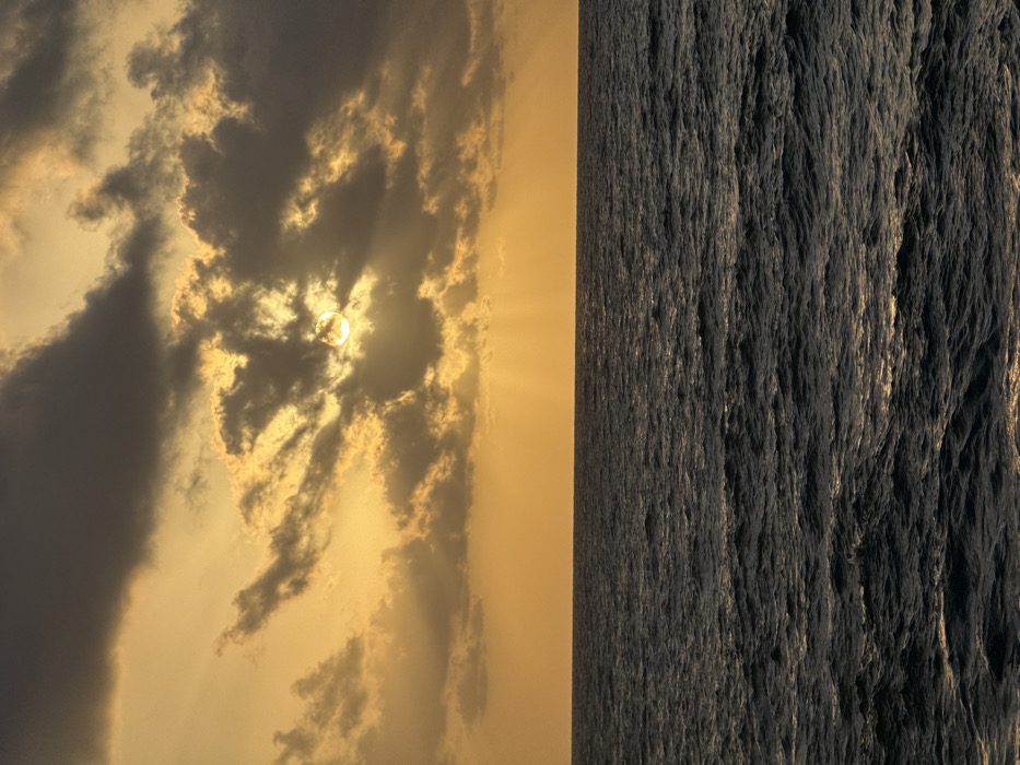 This image depicts a sunset over the Mediterranean Sea, viewed from the coast of Tel-Aviv, Israel. The scene is bisected horizontally by a clear horizon line. The upper half of the image is dominated by a golden-orange sky, with a cluster of dark grey and golden-hued cumulus clouds obscuring most of the sun. A bright, circular portion of the sun is visible through a break in the clouds in the upper-center, radiating distinct crepuscular rays downwards towards the horizon. The lower half of the image shows the dark, choppy surface of the sea, with numerous small waves and ripples. Sunlight reflects off the water in scattered patches, particularly towards the right and along the horizon, creating a shimmering effect. No people, vessels, or landforms are visible.