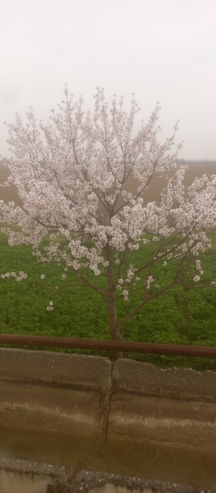 A static outdoor scene, located in the vicinity of Unknown, Unknown, is captured under an overcast sky. The lower foreground features a multi-tiered, light brown-grey concrete barrier or retaining wall, topped by a reddish-brown metal railing spanning horizontally. Centrally positioned behind the barrier is a single deciduous tree, approximately 3-4 meters in height, exhibiting full bloom with numerous small white to pale pink flowers across its branches. The tree's trunk and major branches are dark brown. To the tree's immediate left and beneath its canopy, a field of low-lying, bright green vegetation extends. Further beyond, a large, light brown field of tilled earth is visible. The upper third of the image shows a uniform, pale grey sky, suggesting an overcast condition. No individuals, animals, or active interactions are present within the frame.