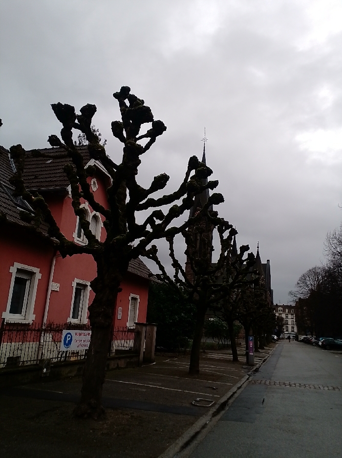 The image captures an overcast urban street scene in Schiltigheim, France