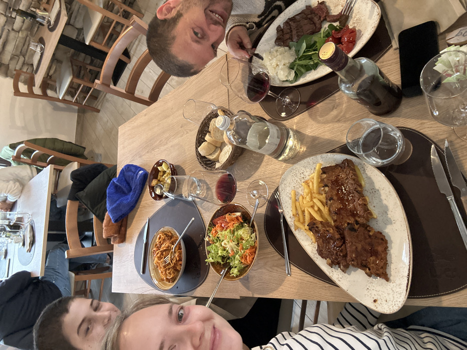 This image depicts an indoor dining scene within a restaurant located in Bellagio, Italy. Four individuals are present around a light-colored wooden table laden with food and beverages. In the bottom-left foreground, a young woman with light hair is smiling, holding the camera for a selfie. To her immediate right, a young male is partially visible, also smiling. Opposite them, on the right side of the table, a man with short dark hair and a beard is smiling towards the camera, holding a fork and knife over a plate. The table displays several dishes: a bowl of spaghetti with red sauce, a bowl of mixed green salad with shredded carrots, a plate featuring barbecue ribs with french fries, and a plate with sliced steak, a portion of mashed potatoes, green leaves, and red peppers. A small bowl containing roasted potatoes and a woven basket filled with bread rolls are also present. Beverage items include multiple wine glasses with red wine, water glasses, a bottle of sparkling water, and a dark bottle with a gold cap. Dark brown placemats are visible beneath the main food plates. A blue knitted beanie rests on the table, and a dark jacket is draped over a chair in the mid-ground. The background reveals additional wooden tables and chairs, with one table occupied by a partially visible person, set against a wall constructed of light-colored stone.