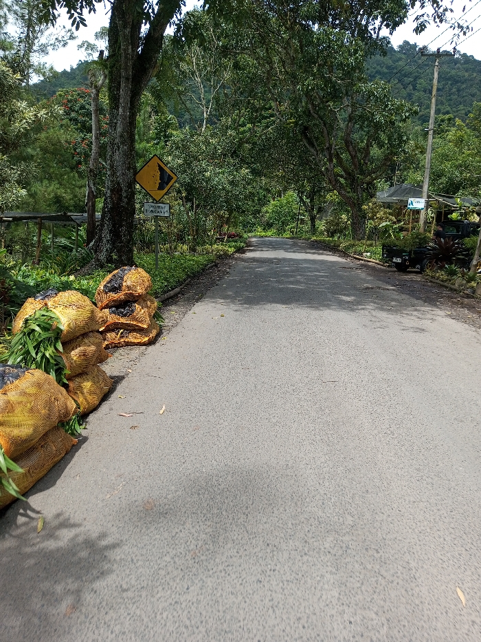 The scene depicts a paved road in Ariyalai, Sri Lanka, extending into a lush, hilly, and vegetated area under clear sky conditions. On the left side of the road, a stack of approximately seven large, coarse mesh sacks, colored yellow and orange, are observed. These sacks contain a dark, possibly charred substance along with green leafy material. Adjacent to the sacks stands a large tree trunk. Further along the left shoulder, a yellow diamond-shaped road sign with a black downward-right pointing arrow is mounted, with a smaller, unreadable white rectangular sign beneath it. Dense foliage and trees line both sides of the road, which appears to be asphalt and shows no visible cracks or significant damage. Scattered dry leaves are present on the road surface. On the right side, a utility pole with overhead wires is visible, along with a small black utility vehicle or pickup truck parked off the shoulder amidst potted plants and what appears to be a plant nursery or roadside stall. The background consists of densely forested hills. No individuals are present, and no active interactions or actions are depicted.