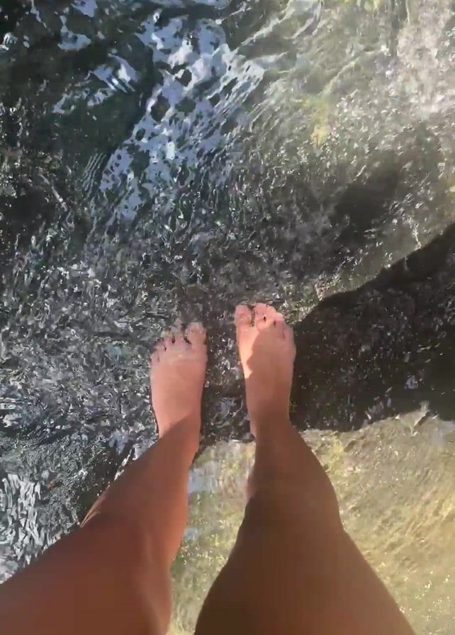 A person stands ankle-deep in clear water, visible from the upper thighs down to their toes. The water is reflecting sunlight and has some ripples. Dark rocks can be seen under the water. The view is from directly above the person's feet.